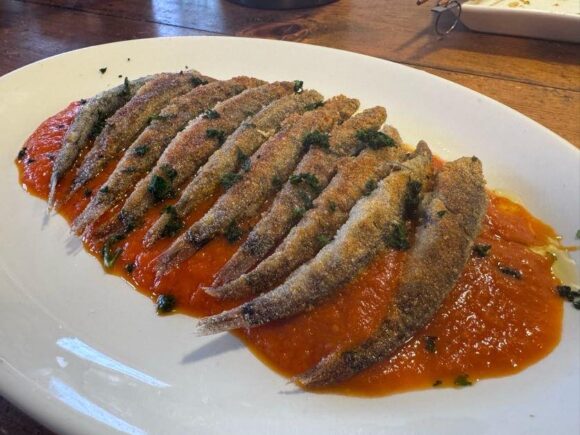 それに、デュラムセモリナをまぶしてしっかり焼き付けてくれたものをパプリカのソースで。美味しい。