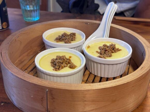 なんと、濃厚極まれりな鶏白湯がベースの茶碗蒸しに肉餡を載せた、中華的茶碗蒸し。