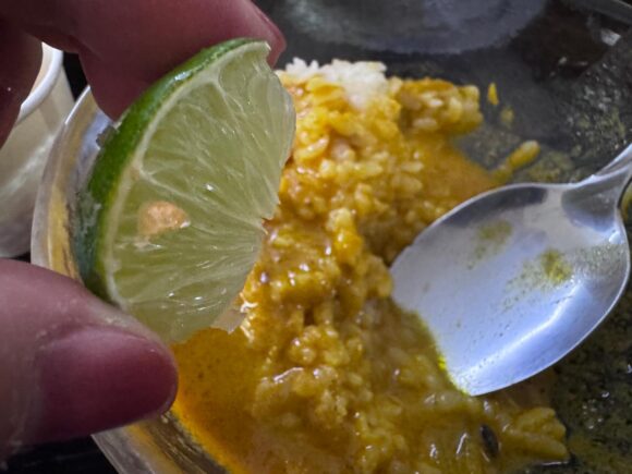 でもベースのカレーソースがさらっと柔らかめなので、受け止めるんですよねえ、ライム。もちろん大量に入れると違和感があるから、最初は数的で試してみてください。美味しかったら追加。