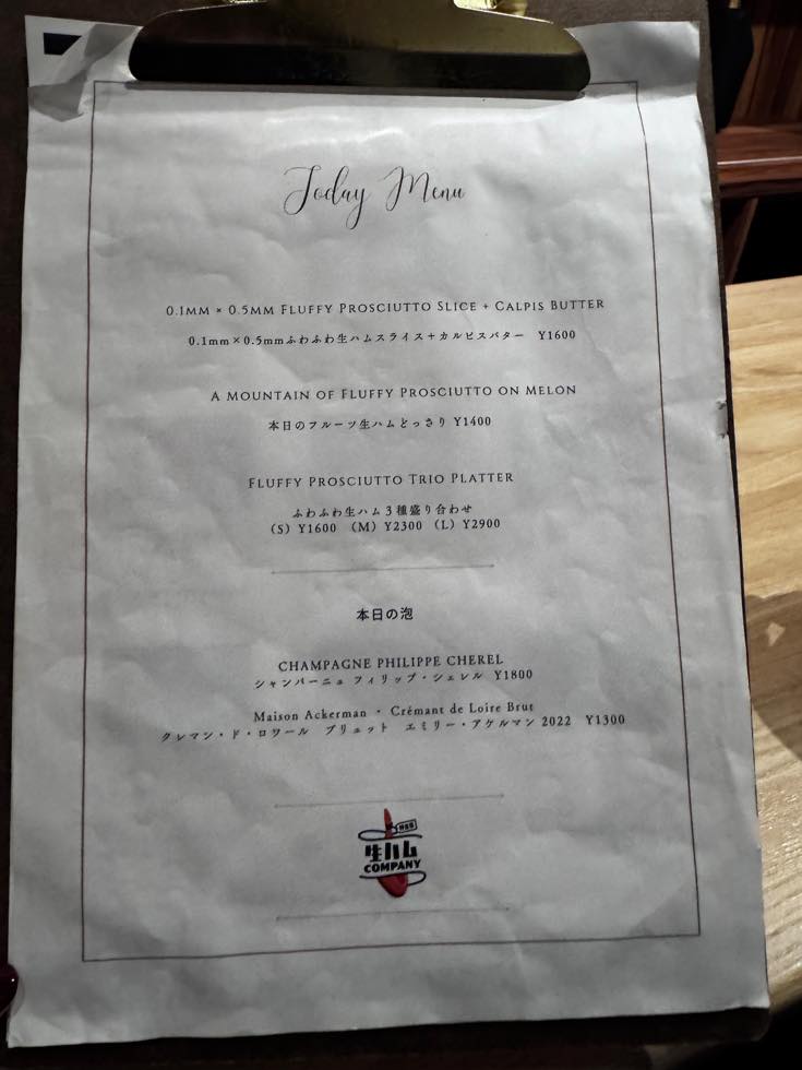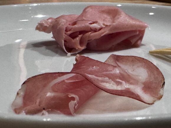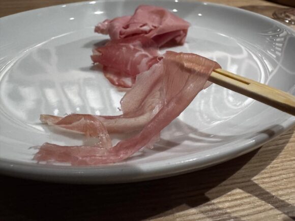 生ハム、この薄さでもその味わいのインパクトが薄れることなく、いやむしろ、空気を含んで口内でそよぐことで、風味を増してるまである。