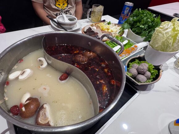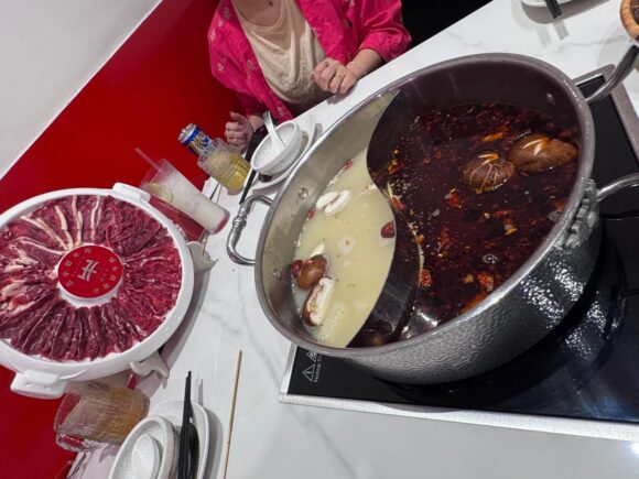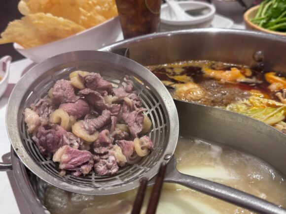 これ、すごく面白かったから、もし2色スープを頼んだら是非やってみて。どっちも美味しかったけど、自分は麻辣で茹でたお肉が好きだった!