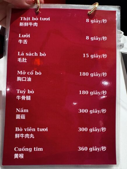 ちなみに、お肉の部位によって、何秒間茹でてや?という一覧表があって親切だな、と思ったけど、そんなの、1回にどのくらいの量を一緒にゆがくかとか、鍋内のスープの温度は?とか、鍋内の具材の多さとかにもよりけりなので、まあ、あくまで「目安」、な?