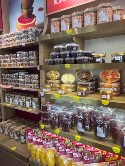 並んでいるのは、チョコレート、ナッツ、ドライフルーツ、そしてお茶やコーヒー。