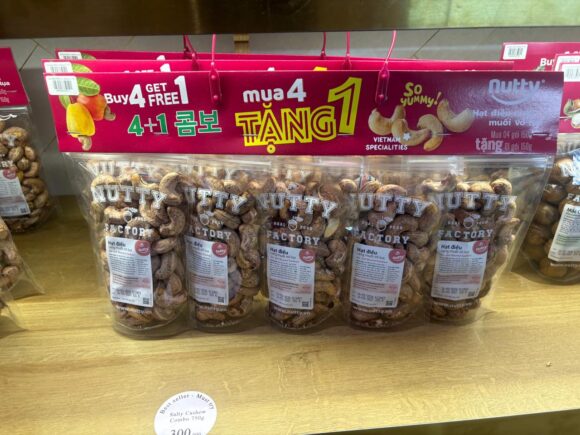 フレーバーは限定的だけど、4つ買ったら1個おまけになるよーという、パッキングがされたものもある。(この日はすっぴんのカシューナッツしかありませんでした)