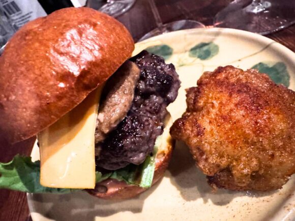 熟成三右衛門豚と黒毛和牛のミニバーガー シェリーマリネの地鶏フリット