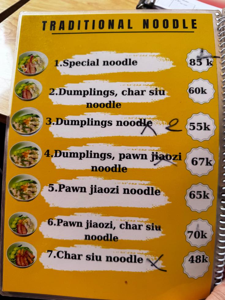 そのベースのお味にトッピングをあれこれ組み合わせることで価格を変えてる様子。チャー主、ワンタン、エビ餃子など。