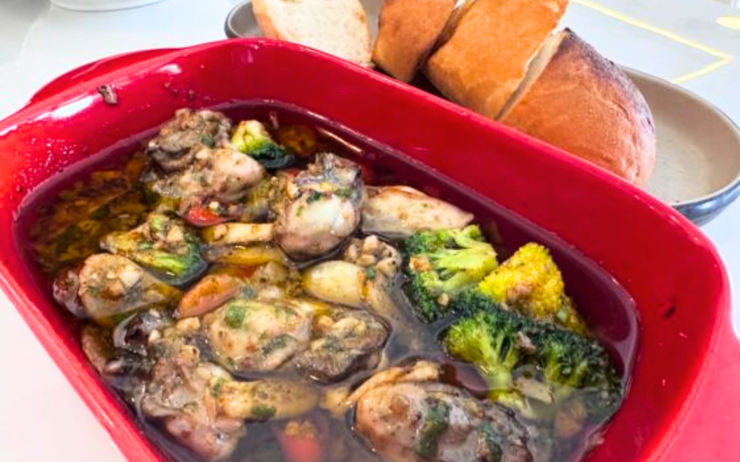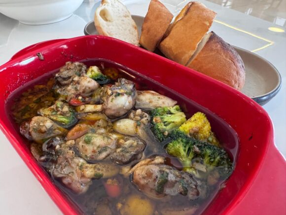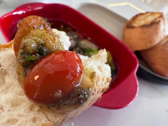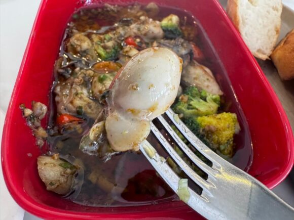一緒にオイルで煮られてるガーリックやトマトがめっちゃ効いてる。