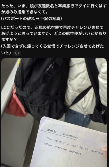 お友達と海外旅行に出かけようとした娘さんが、パスポートの破損で出国を許されなかったと。そのポストがこちら。