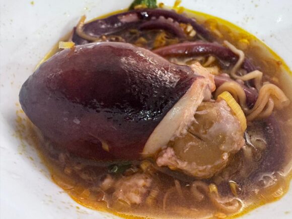 フルフルとその身を震わせながら口の中に滑り込み、麺と麺の間にたたえたレモングラスと、タコの風味が香るスープで口中を満たす。所々に香るミントがアクセント。