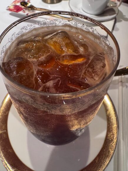 店内も、心なしか昼、見るよりもシットリとして見えて、豪華な様子に磨きがかかってるように感じられるのもまた魅力。ただし、夜、奥の席はディナー席になって居て、カフェ使用の場合入り口側に通されることが多いようです。まぁ、それでも十分素敵なんですが。