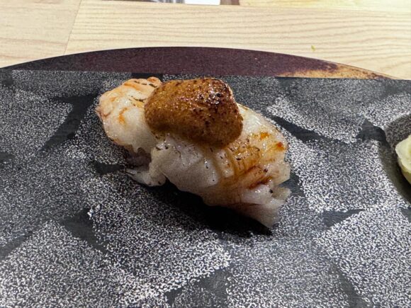 あ、話の途中だけど、↓縁側にあん肝のパテやったかいな。それを添えて炙った寿司、飛びました(-人-)