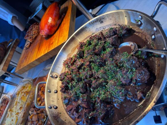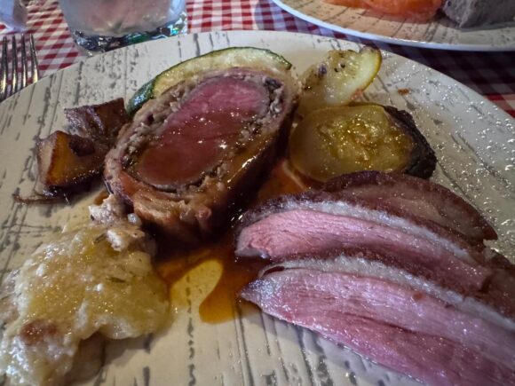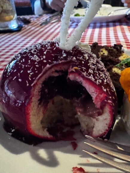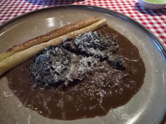 ヤギチーズかな。チーズが中に仕込まれたイカ墨の生地のラヴィオリ。それにアミガサダケのソース。いやこれビュッフェで出すメニューじゃなかろうよ😅