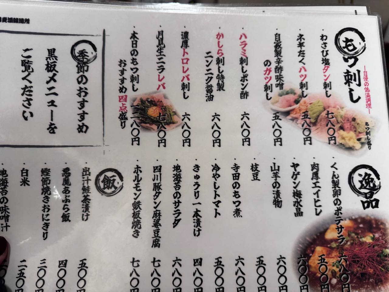 見落としてた卓上メニューもあって、モツ刺しとかあるのねー。多分低温調理のなんだろうけど。