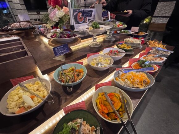 エントランスにあるというのがちょっと意外だったし、こじんまりだな?とは思ったけど、翌朝、このこじんまりスペースが、あんなにパワフルな朝食会場になろうとは!