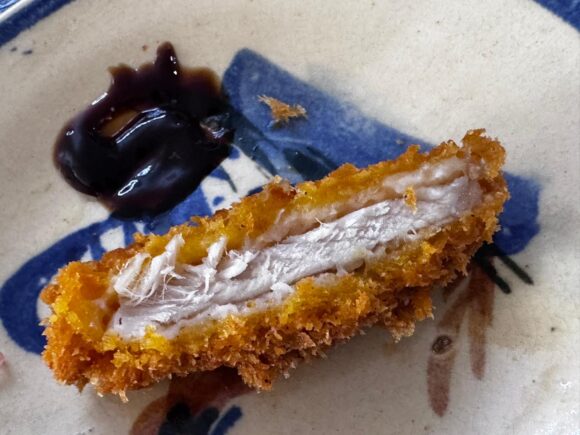 加えて、中身のお肉は柔らかく食べられる処理がされてあり、それは良いことなのですが、衣の厚みがと硬さとのコントラストにより、ちょっと肉の存在感が少ない感じ。