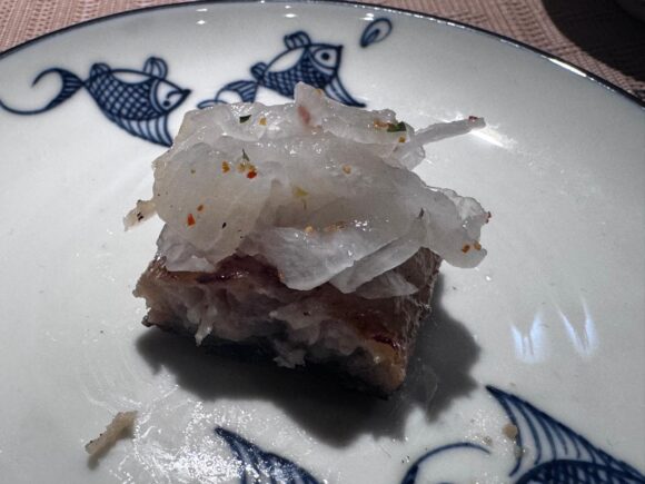 添えられた花びらみたいな大根の酢漬けとの相性もよく、そんなに脂っこい身ではなかったけど、大根との相性、よし。