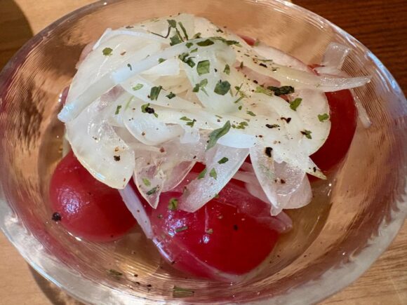 あ、個人的に好きなので、トマトのマリネも頼んでみました。サラダ、ではなくマリネ。良きですな。