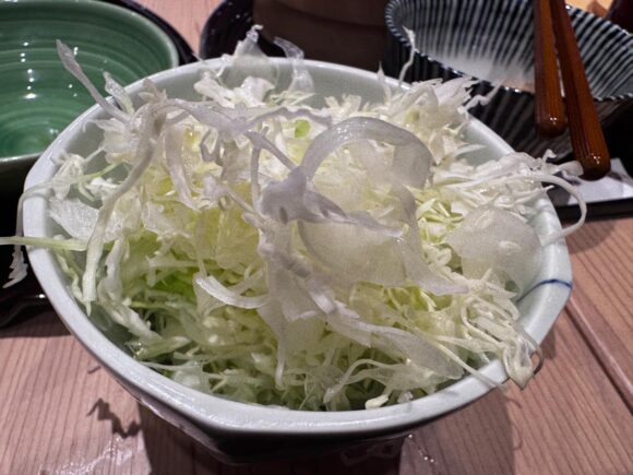 とりあえず、出されたキャベツはサクッと食べ切って、最初のお替わり。お願いすると、たっぷりキャベツを盛ったものを席まで持ってきてくれて、都度サーヴしてくれるシステムです。