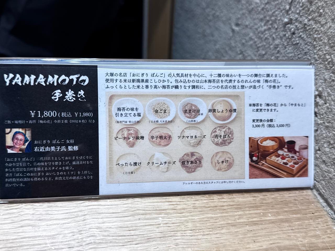 しかし、せっかく来たのに、ケチったようになるのも嫌だなぁと思ってよく見たら、メニューの右側の方に海苔のグレードを変えることで、3300円になるメニューがあったので、そちらにしてみました。