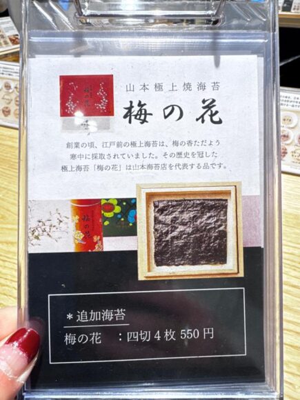 「梅の花」というのがスタンダードで、「やまもと」海苔を追加できるようになってるんですね。