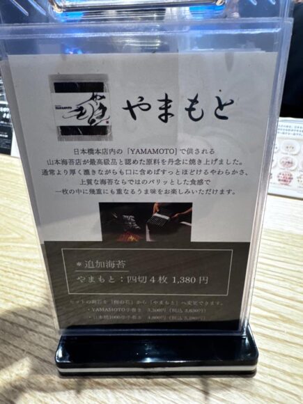 セットはスタンダードモードにしておいて、味わってみたいだけなら、この「やまもと」と言う種類の海苔を追加で頼む方がちょっとだけお得。