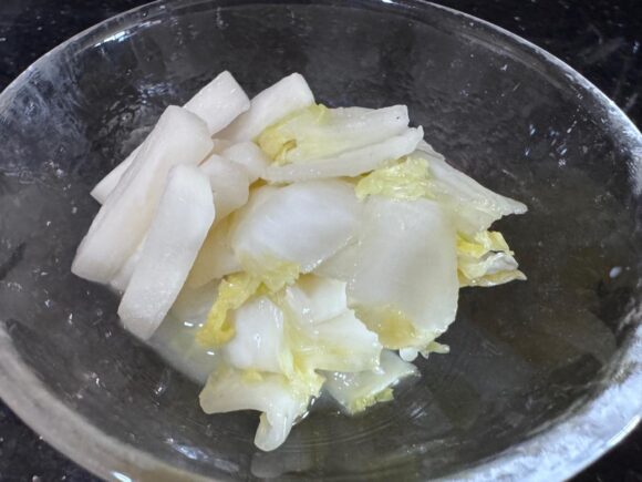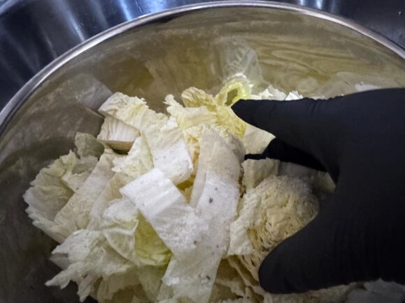 白菜をベトナムの藻塩で塩揉みしまして。。。