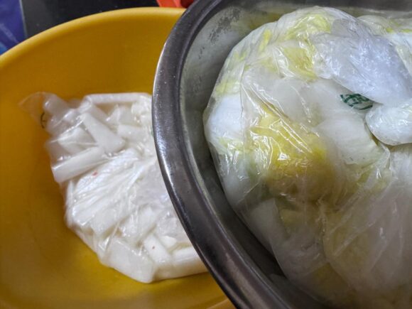 どちらも調味液に漬けたり塩揉みしたあと、ポリ袋に入れて空気を抜き、万が一水分が漏れても慌てないようボウルに入れて、どちらかをどちらかの上に乗っけて重しがわりにw